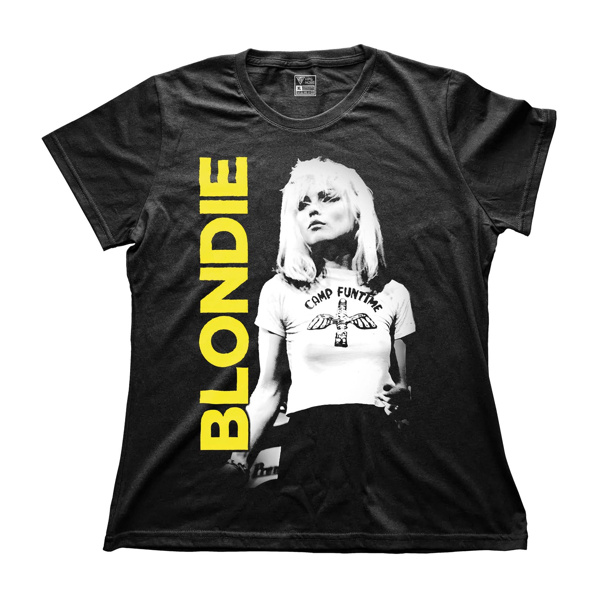 Diseño con Debbie Harry en una pose relajada y segura, acompañado de una gráfica vertical que le da un look moderno y llamativo. La camiseta “Camp Funtime” aporta un aire vintage que mezcla actitud, estilo urbano y esencia Blondie.